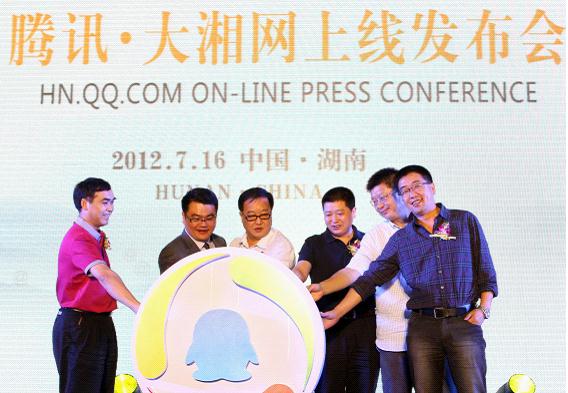 (省人大常委會(huì)副主任肖雅瑜,省委網(wǎng)宣辦主任卿立新,省工商局副局長(zhǎng)于云彩,騰訊公司網(wǎng)絡(luò)媒體事業(yè)群總裁劉勝義,湖南出版投資控股集團(tuán)總經(jīng)理張?zhí)烀鳎心蟼髅礁笨偨?jīng)理、瀟湘晨報(bào)董事長(zhǎng)龍博共同宣布了大湘網(wǎng)的上線(xiàn))