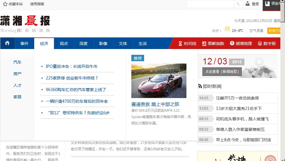按照中南傳媒的戰(zhàn)略部署,瀟湘晨報(bào)今年將強(qiáng)力推出互聯(lián)網(wǎng)業(yè)務(wù)平臺,著手建立線上收費(fèi)模式,售賣晨報(bào)數(shù)字版。瀟湘晨報(bào)網(wǎng)在內(nèi)容制造上立足于達(dá)到“三個(gè)第一”,即第一觀點(diǎn),第一資訊,第一數(shù)據(jù)。除了常規(guī)的新聞?lì)l道整合了瀟湘晨報(bào)系的新聞內(nèi)容外,網(wǎng)上讀者們還能看到新聞地圖、時(shí)間線、圖解指數(shù)、湖湘地理等特色頻道。
