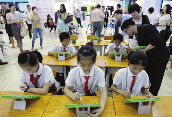 在演示上課的過程中,“老師”手執平板電腦,“學生”的課桌上也每人有一臺平板電腦。“老師”播放的拔河比賽動畫,“學生”在自己的平板電腦上可以同步看到,并在電腦上完成習題。電腦系統后臺可以實現對每位學生所做客觀題的對錯進行判分,并反饋到“老師”手中的電腦上,老師據此掌握到了每個學生課堂學習情況,并可以進行重點教學和分層次教育。