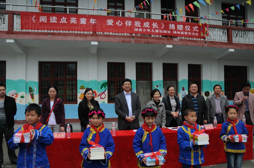 巖灣小學(xué)地處靖州最偏遠(yuǎn)地區(qū),離縣城60公里,條件非常艱苦,辦公和生活設(shè)施落后,同時(shí)又是周邊4個(gè)村唯一的學(xué)校,現(xiàn)有110名學(xué)生。2012年8月,珠海市政府干部貝華退休后,義務(wù)到這里支教,并積極為孩子們爭取現(xiàn)代教育資源。縣教育局也著力為學(xué)校改善辦學(xué)條件,將教學(xué)樓、食堂改造一新,并建了籃球場和幼兒游樂場,開設(shè)了電腦室、圖書室、音樂教室,接收了捐贈(zèng)校車,提供了免費(fèi)午餐。但圖書室還是空蕩蕩的,給孩子們留下了一個(gè)遺憾。湖南少年兒童出版社了解情況后,募集了700余冊(cè)圖書、100套書包及文具、衣物等,派專人送到了學(xué)校。