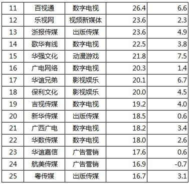 本次評選出的50強企業涵蓋影視娛樂、出版傳媒、視頻新媒體、廣告營銷、動漫游戲和數字電視六大類別,中南傳媒位居總榜第二位、出版傳媒細分領域第一位。在其他細分領域,萬達文化、省廣股份、完美世界、優酷土豆、百視通分別位居影視娛樂、視頻新媒體、廣告營銷、動漫游戲和數字電視細分領域榜首。